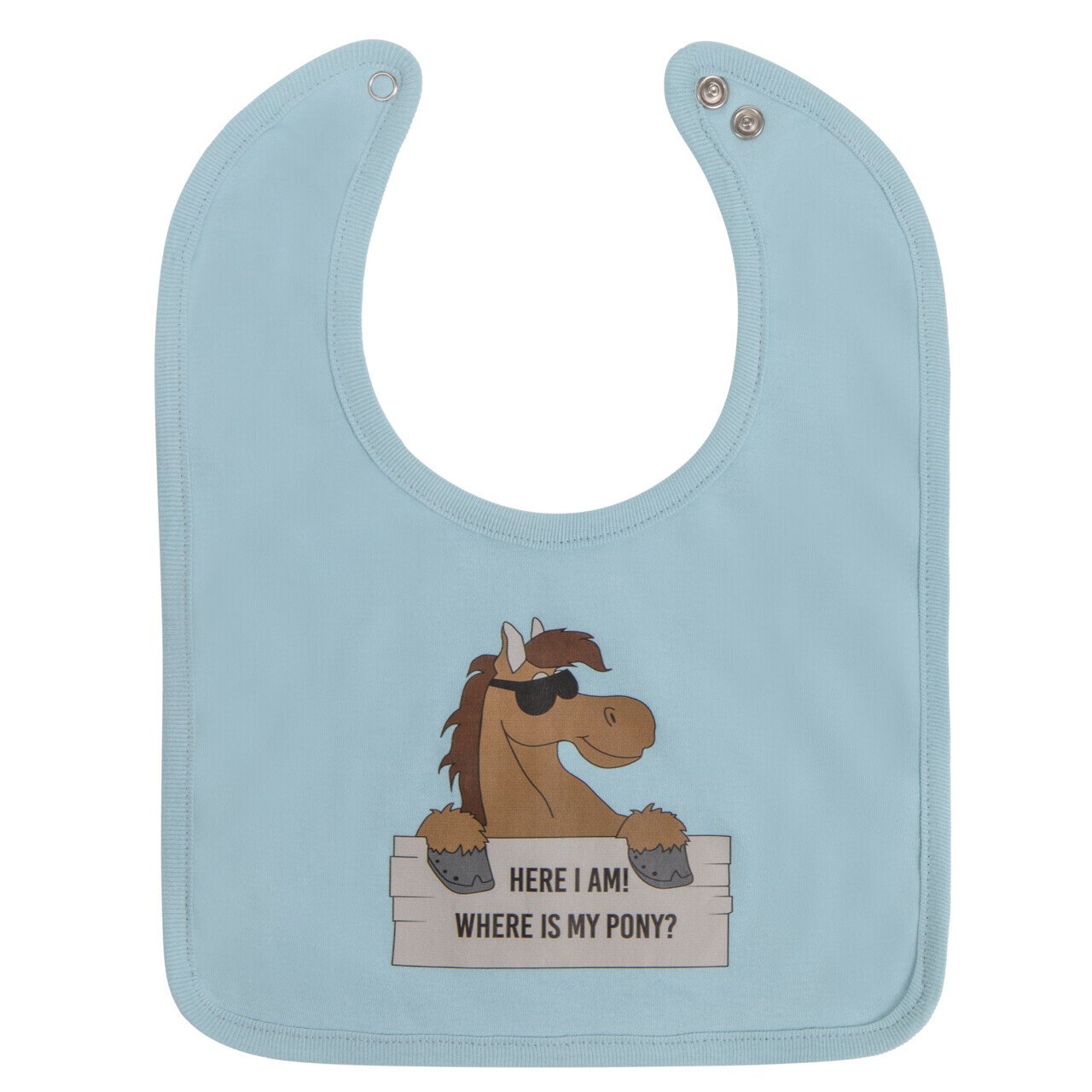 Babero a juego con el body Bobby. El babero tiene el texto: "¡Aquí estoy! ¿Dónde está mi poni?". Mantiene la ropa de tu bebé seca.
