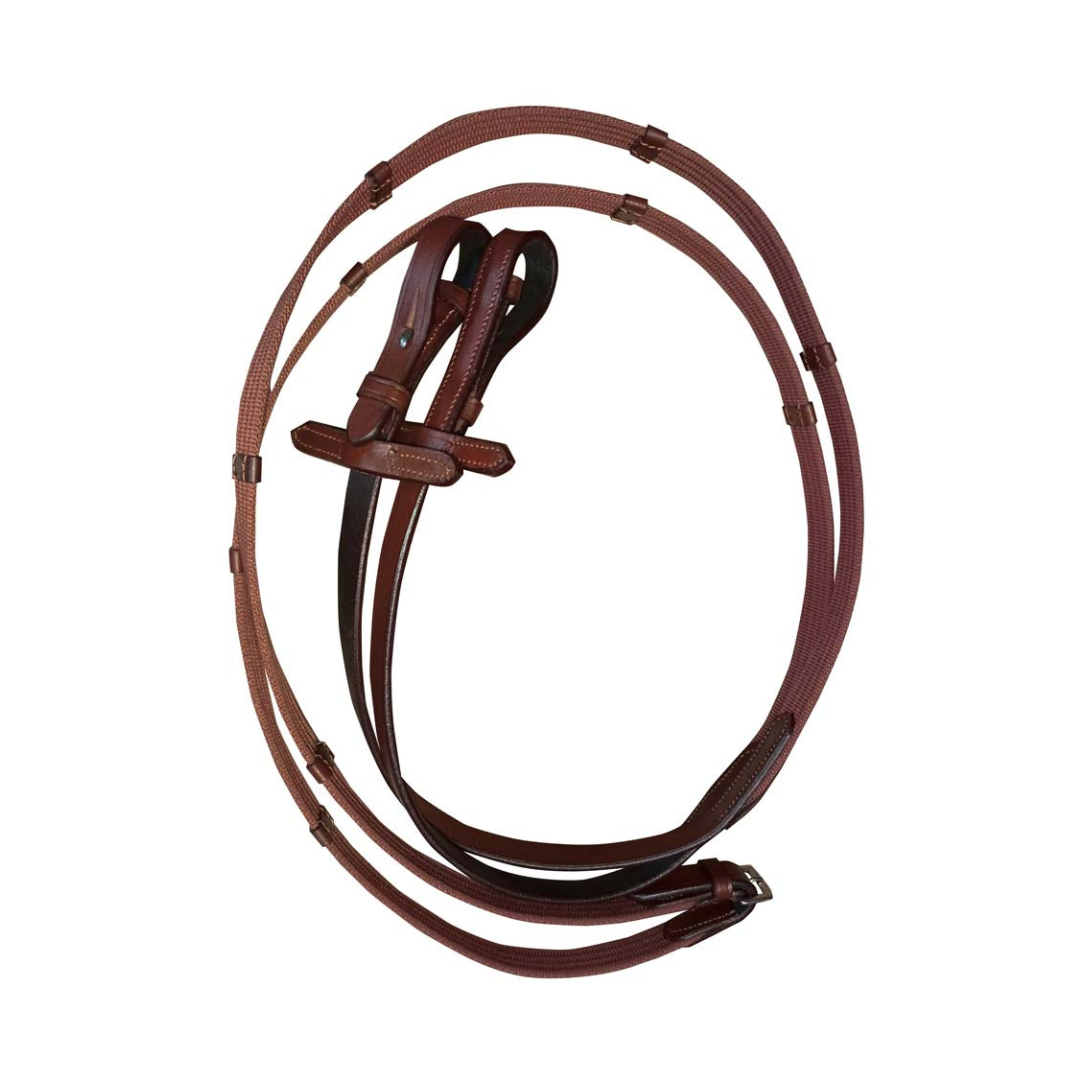 Incluye unas riendas de lona con gancho de alubia y con topes de cuero, unidas en su terminación con hebilla.
