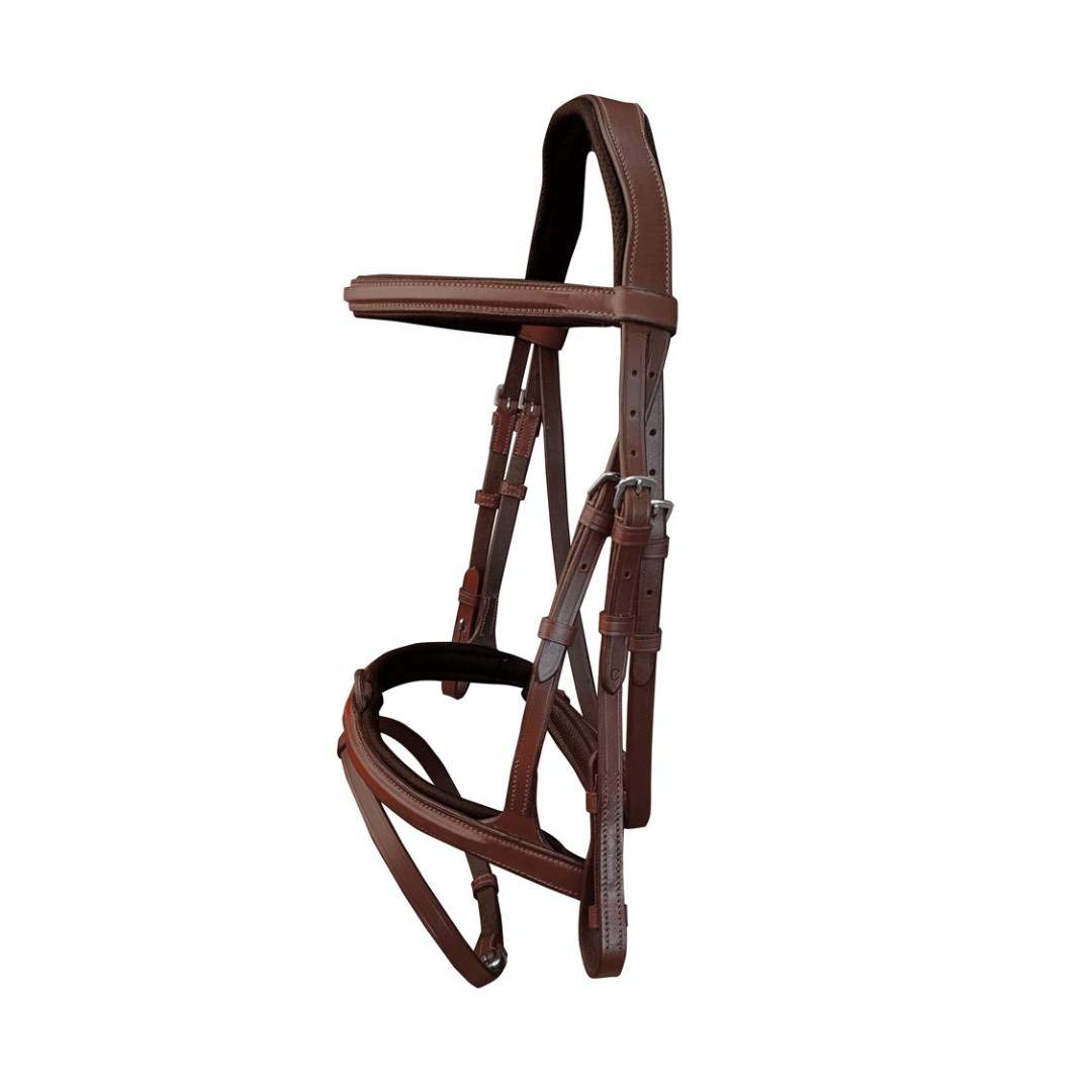 Muserola alomada de suave acolchado. Resalte de cuero al igual que la frontalera.