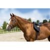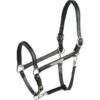 Jaquima de cuero de búfalo con doble ajuste de testera y ajuste de muserola ancho 26 mm, por hebillas y fijación rápida del ahogadero por mosquetones. Muserola y testera acolchadas y forradas de cuero tono sobre tono.