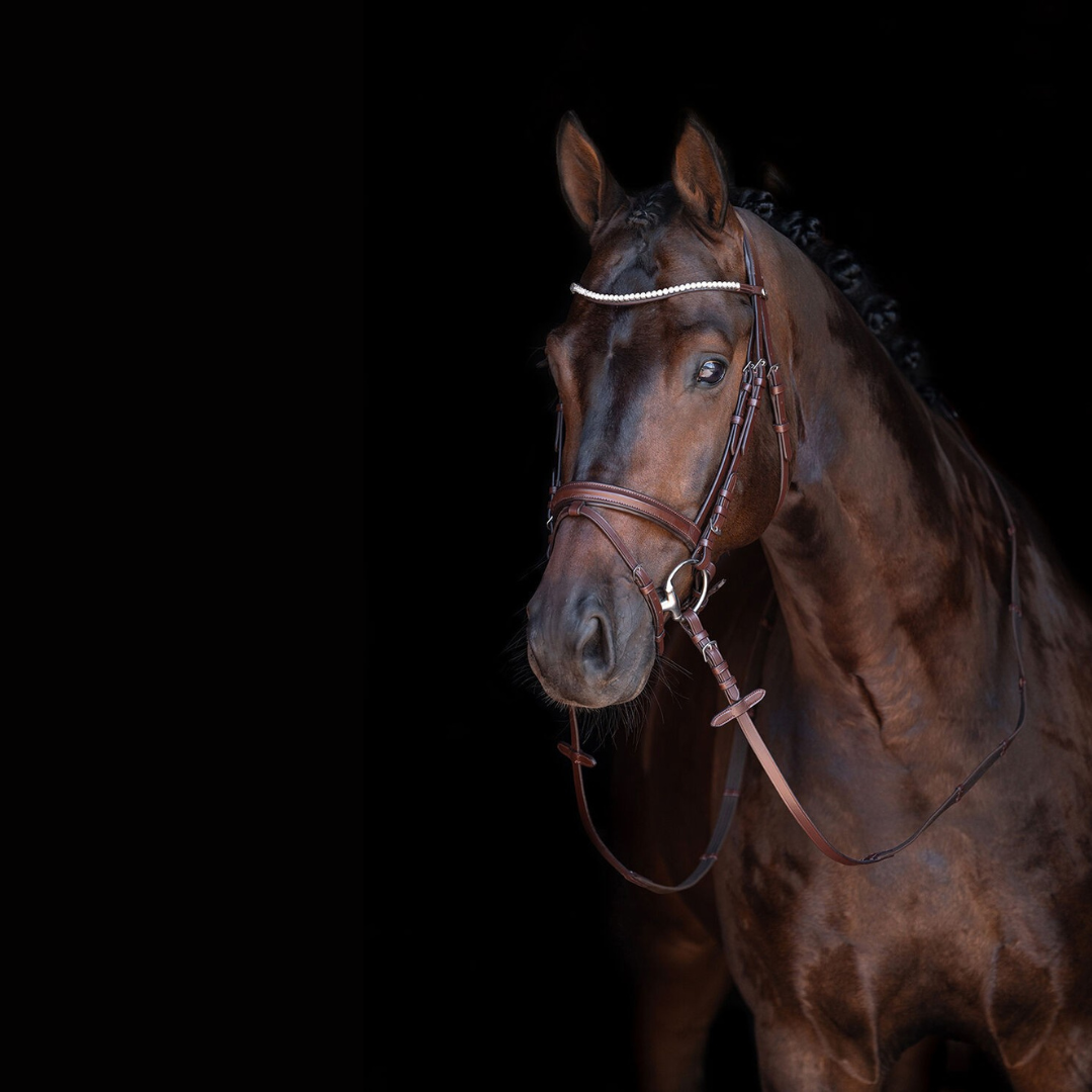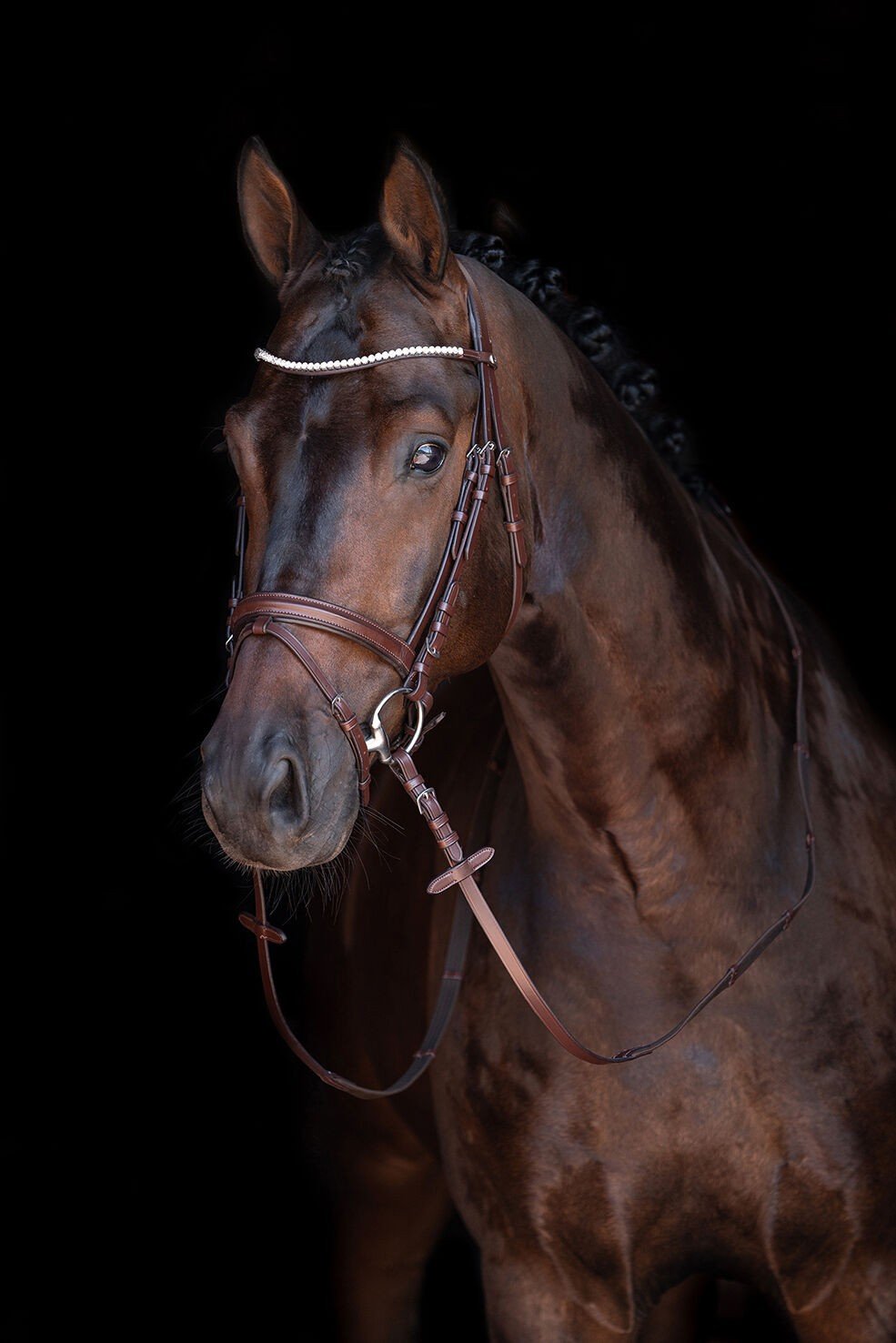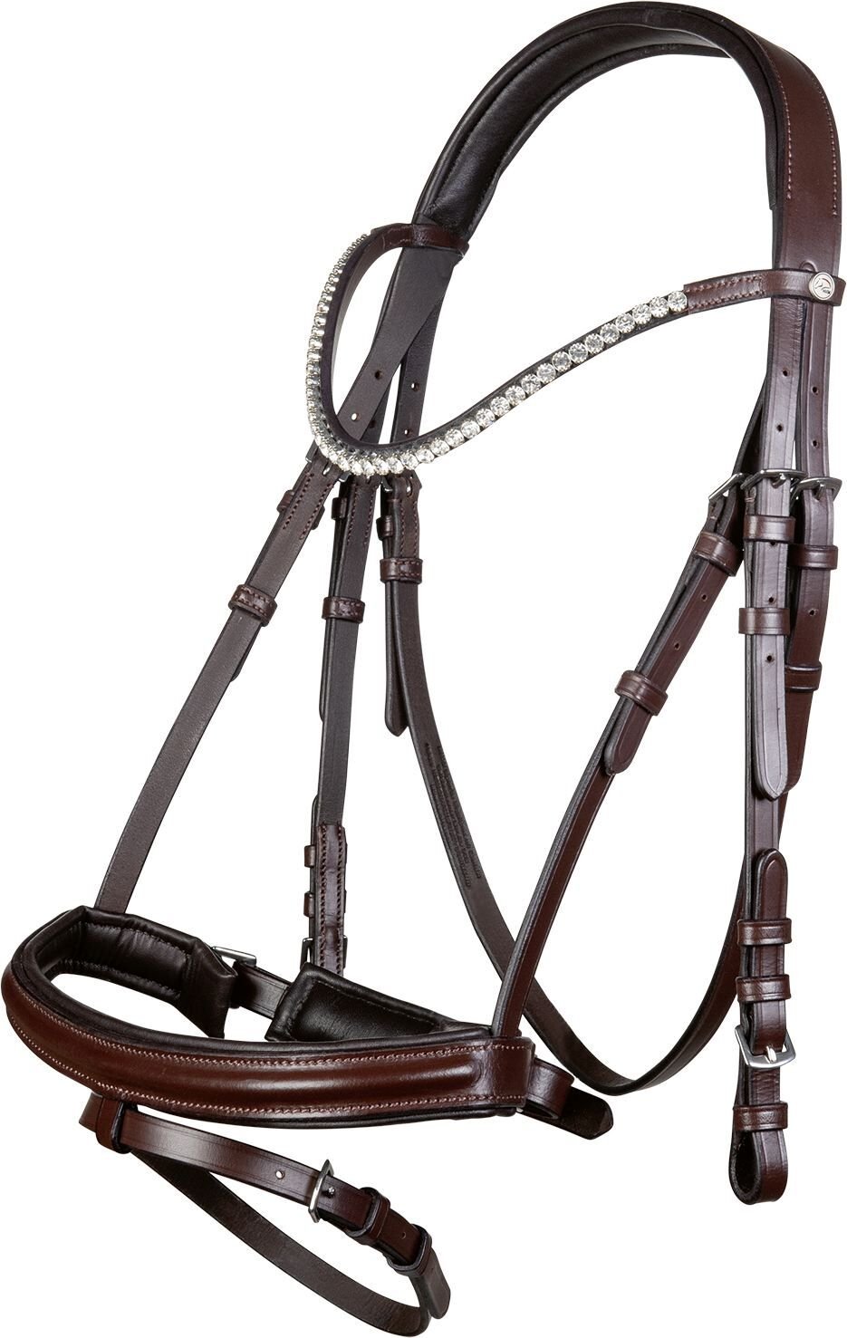 La cabezada Mia de HKM está fabricada con cuero de alta calidad y herrajes resistentes en color plateado para un acabado elegante. Cuenta con una muserola y frontalera acolchadas, una suave almohadilla en la barbilla y riendas continentales tejidas, ofreciendo así comodidad para tu caballo. La frontalera también incluye piedras brillantes para un toque de elegancia.