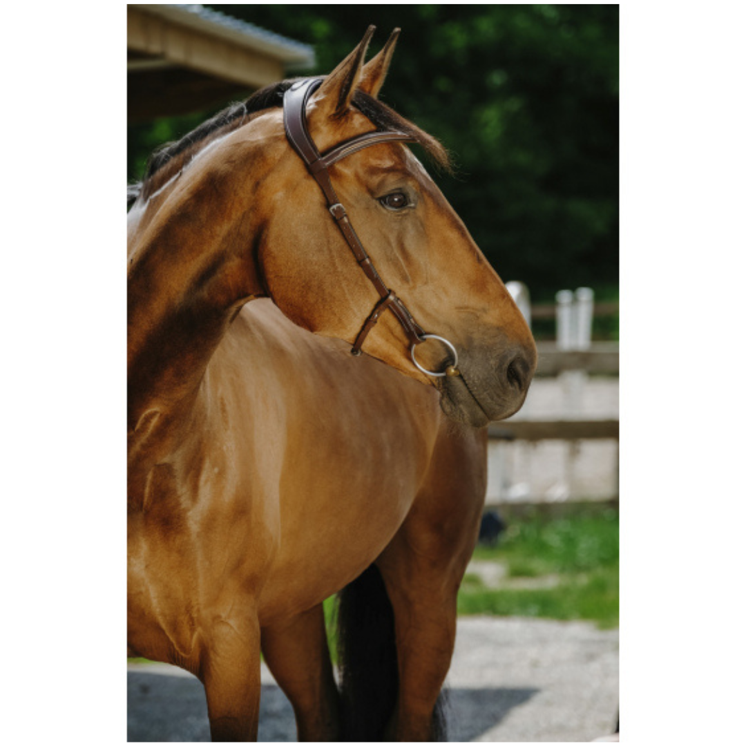 Diseñada de manera anatómica, esta cabezada asegura un ajuste cómodo, mientras libera la base de las orejas y reduce la presión ejercida en la nuca del caballo para ofrecerle el máximo bienestar. Para garantizar un confort adicional, la cabezada y el frontal están forrados con cuero de vaca suave y flexible.