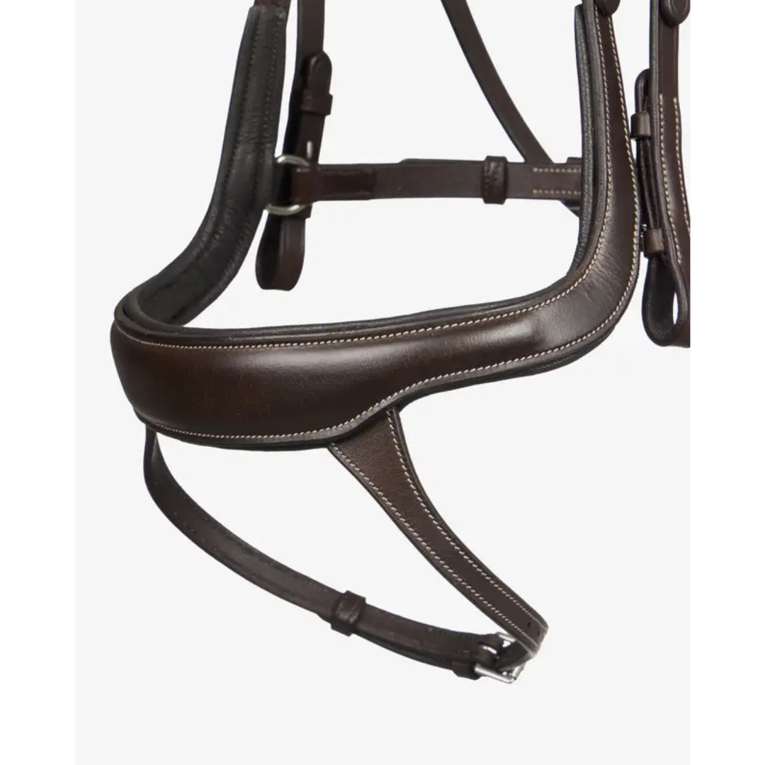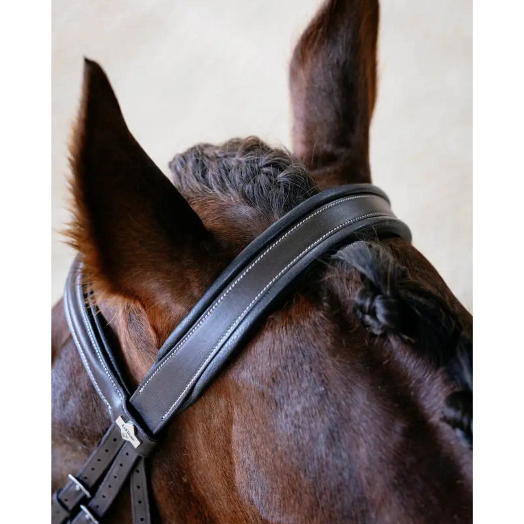 La cabezada cuenta con una muserola y una frontalera anatómicos y ligeramente acolchados, que proporcionan protección y una mejor distribución de la presión. La muserola inferior se coloca separada del freno, con un funcionamiento similar a la muserola tipo drop.
