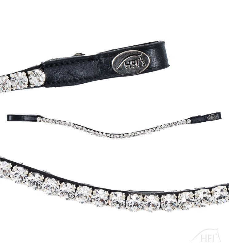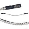 Preciosa y delicada frontalera recta con pedrería en tonos blancos sobre cuero negro y hebillas plateadas. Es el toque perfecto para levantar el look de tu partner.