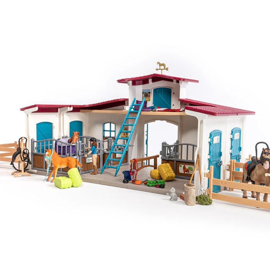 ¡Prepárate para vivir fantásticas aventuras! En el establo de caballos Schleich Horse Club podrás prepararte de la mejor manera posible para cualquier aventura ecuestre. Con el cepillo de masajes, el rascador de cascos, y la rascadera, los caballos estarán arreglados siempre. Después se les puede recompensar con una zanahoria o con un día en el parque.