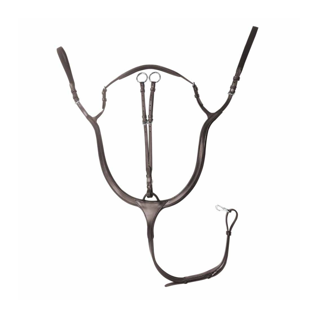Con refuerzo de cuero en la zona del pecho y anilla de cuero central para enganchar la martingala media tijerilla.