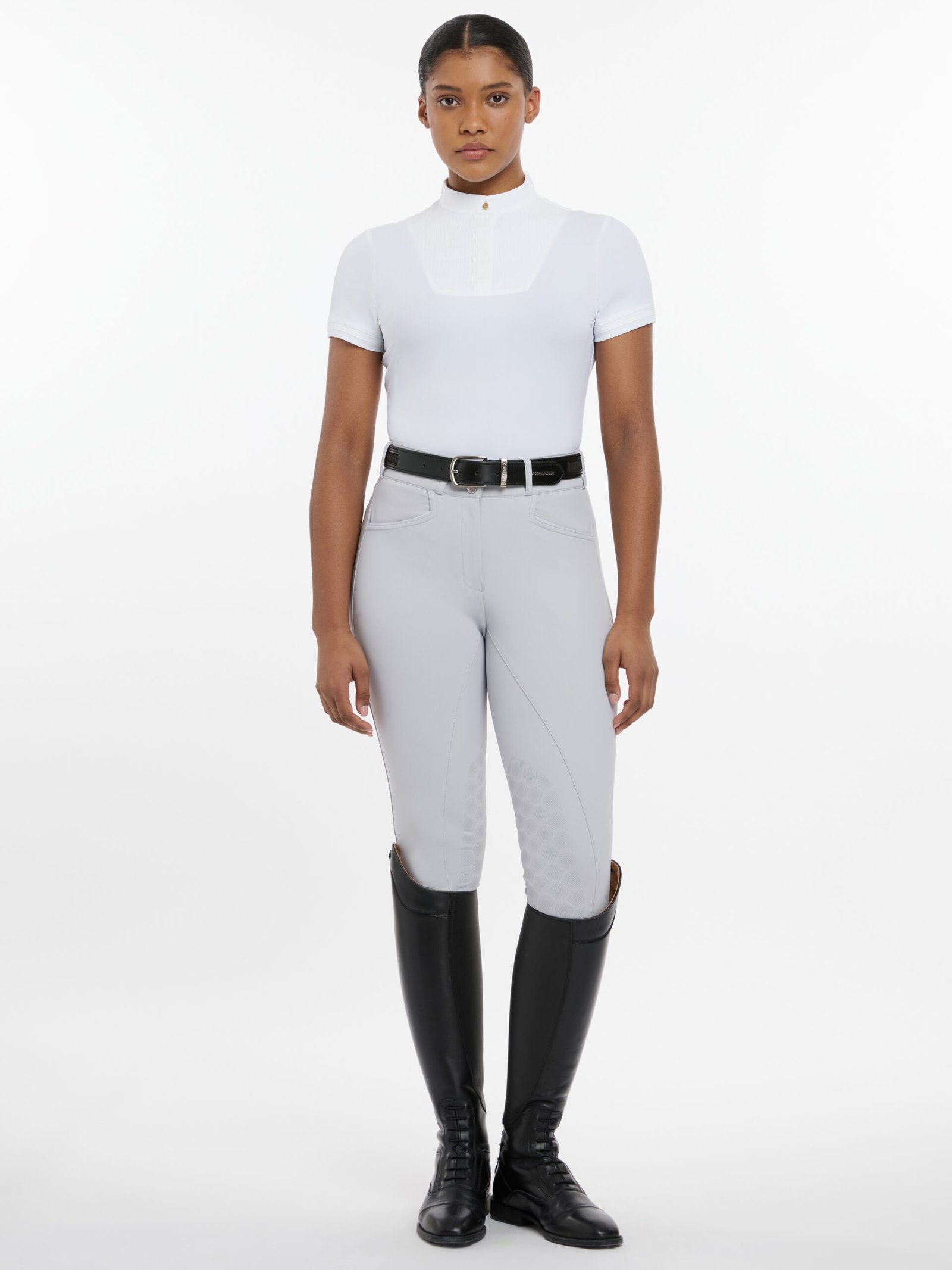 Con una zona transpirable bajo la manga, el tejido técnico de alto rendimiento te mantendrá fresca y cómoda mientras montas. Un frente texturizado añade sofisticación. El hermoso detalle en el cuello destaca entre la multitud, con un cuello recto terminado con una tapeta de imán invisible. Incluye presillas laterales para asegurar la corbata de concurso (stock).