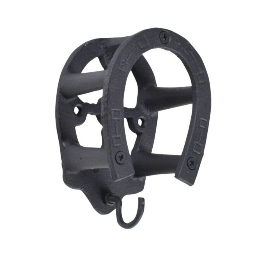 Porta riendas y cabezada de hierro fundido con lindo diseño de herradura.
