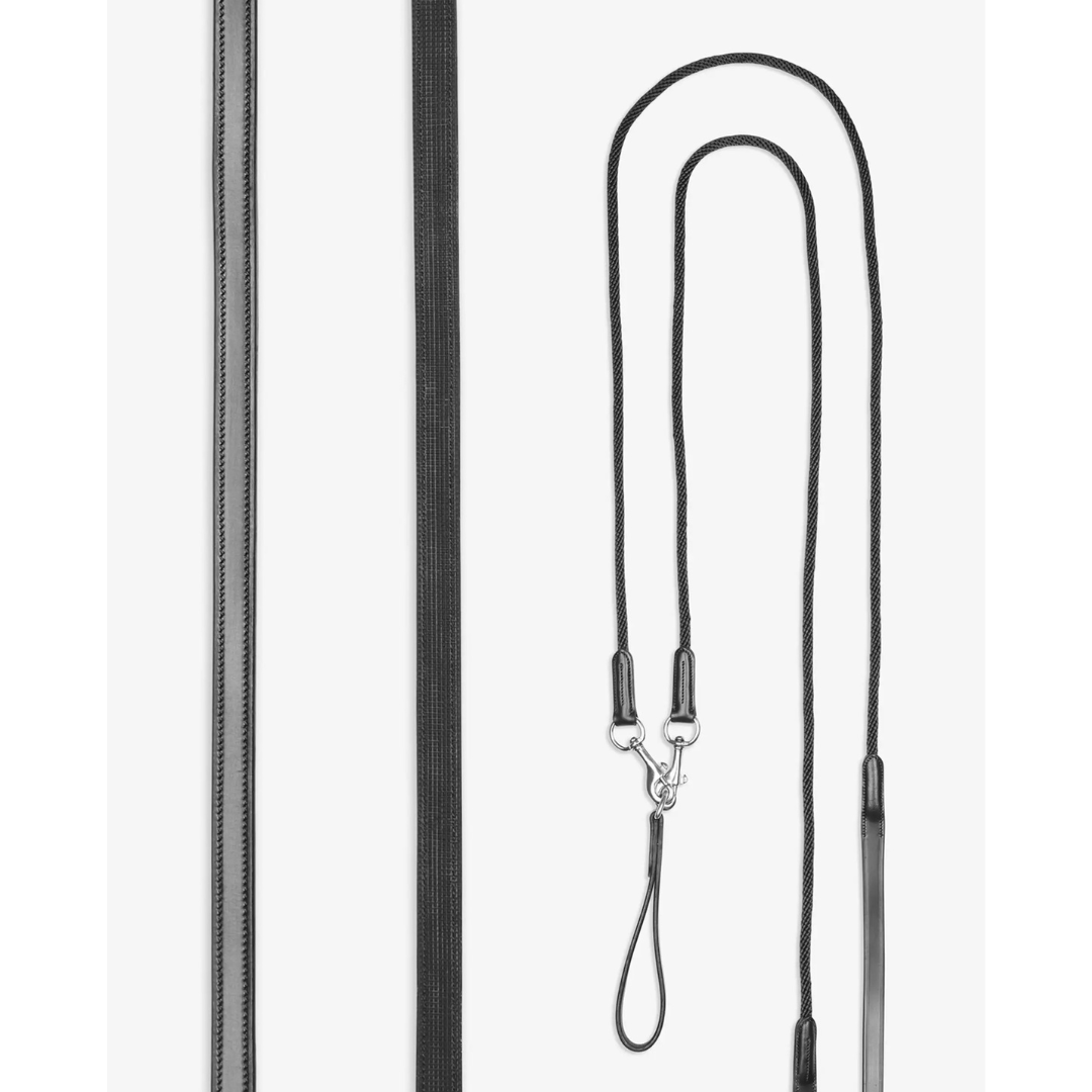 Estas riendas cuidadosamente diseñadas, cuentan con una sección de cuerda suave que se desliza sin problemas a través del bocado. Secciones de cuero con un delgado forro de goma se sientes suaves en las manos, permitiendo que el contacto se pueda reducir o mantener según desee.